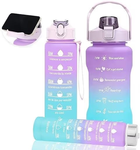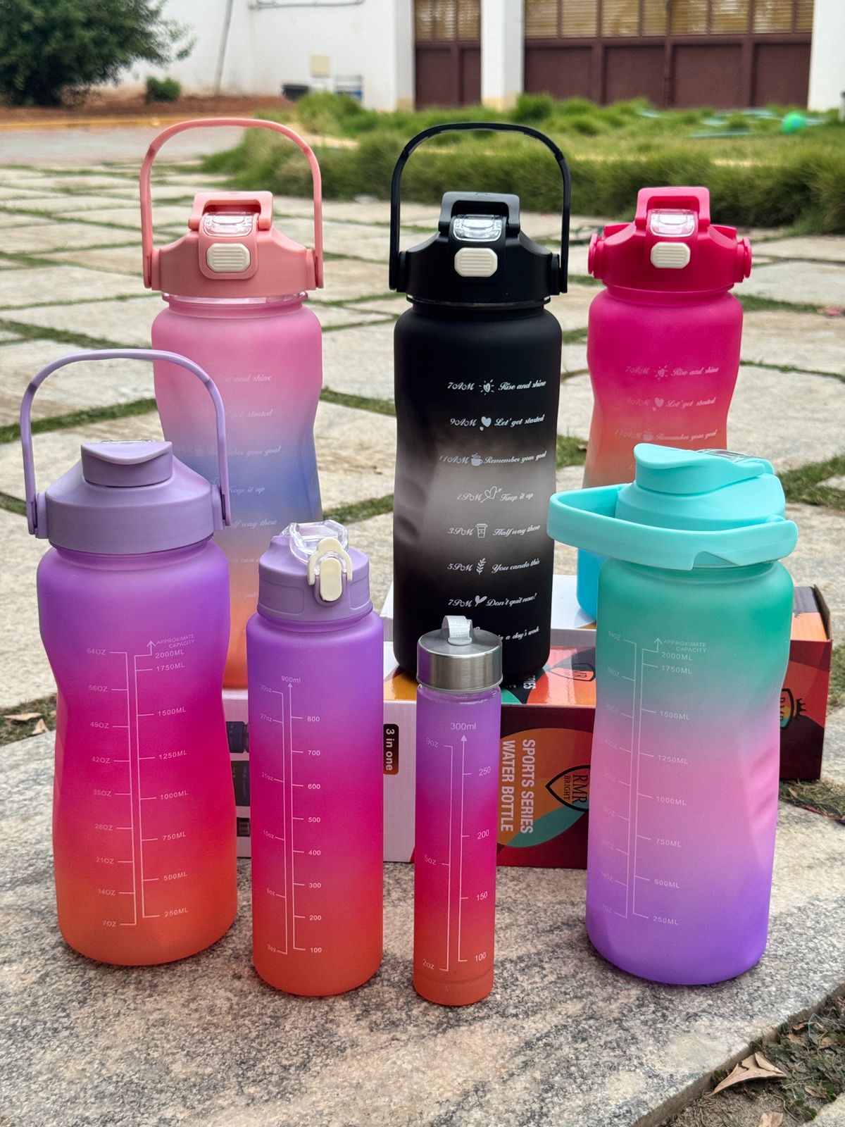 The set typically includes three different capacities: a large 2-liter (approx. 64oz) bottle, a medium 900 ml (approx. 32oz) bottle, and a smaller 300ml (approx. 16oz) bottle.