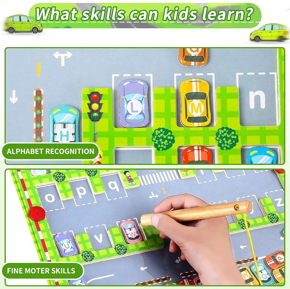 Match the Letters: Some of the parking spaces are marked with different letters. Help your child park the cars in the correct spaces according to the letters on the board.