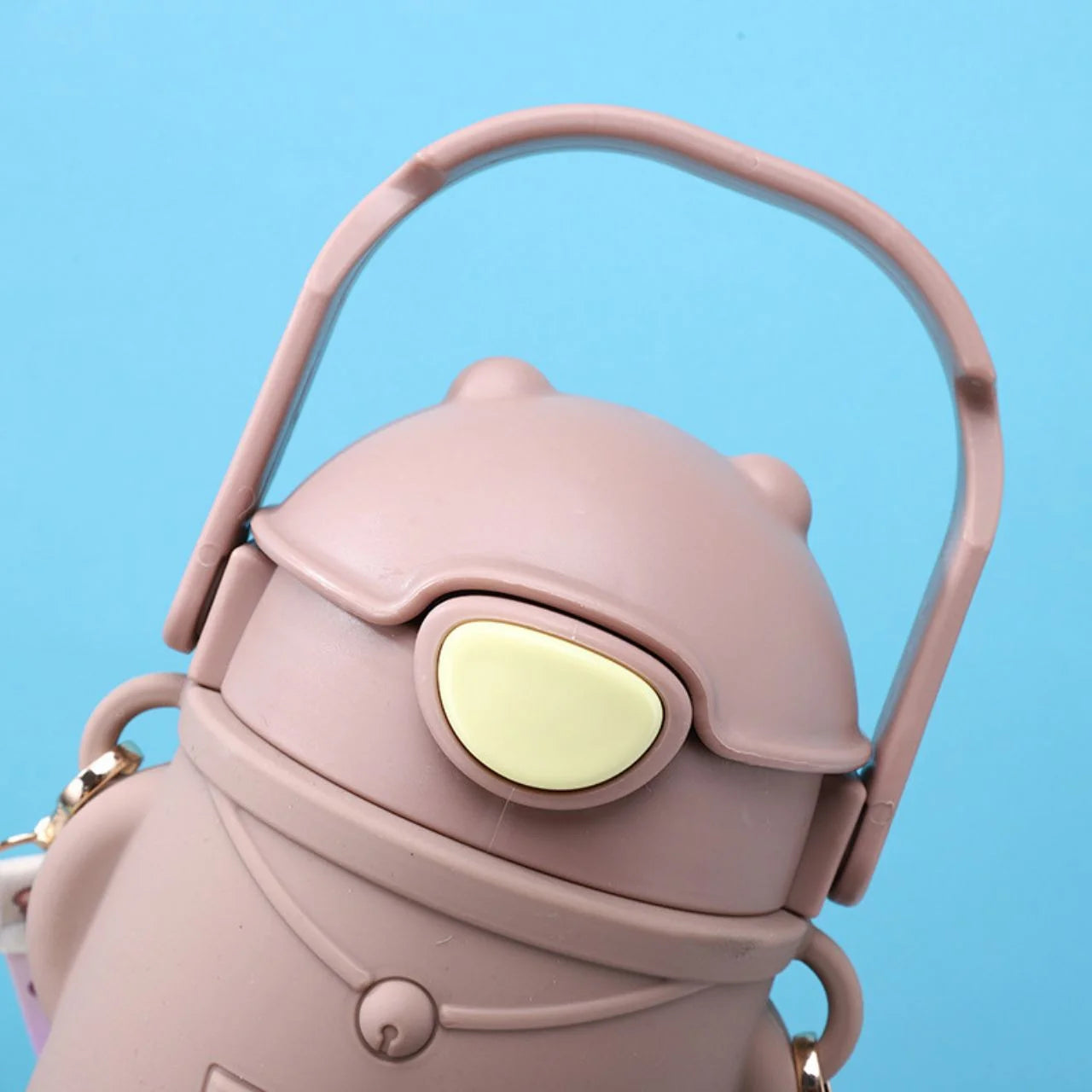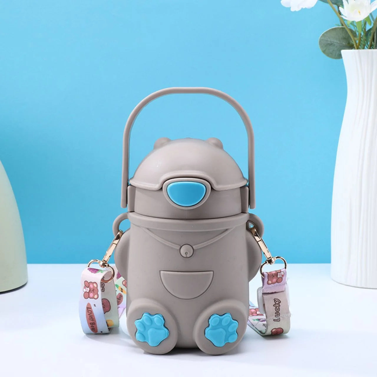 The bottles feature an adorable teddy bear design with a silicone cover that has paw prints at the bottom. The lids usually have a flip-top or push-button mechanism with a built-in straw for spill-proof sipping Capacity:500 ml