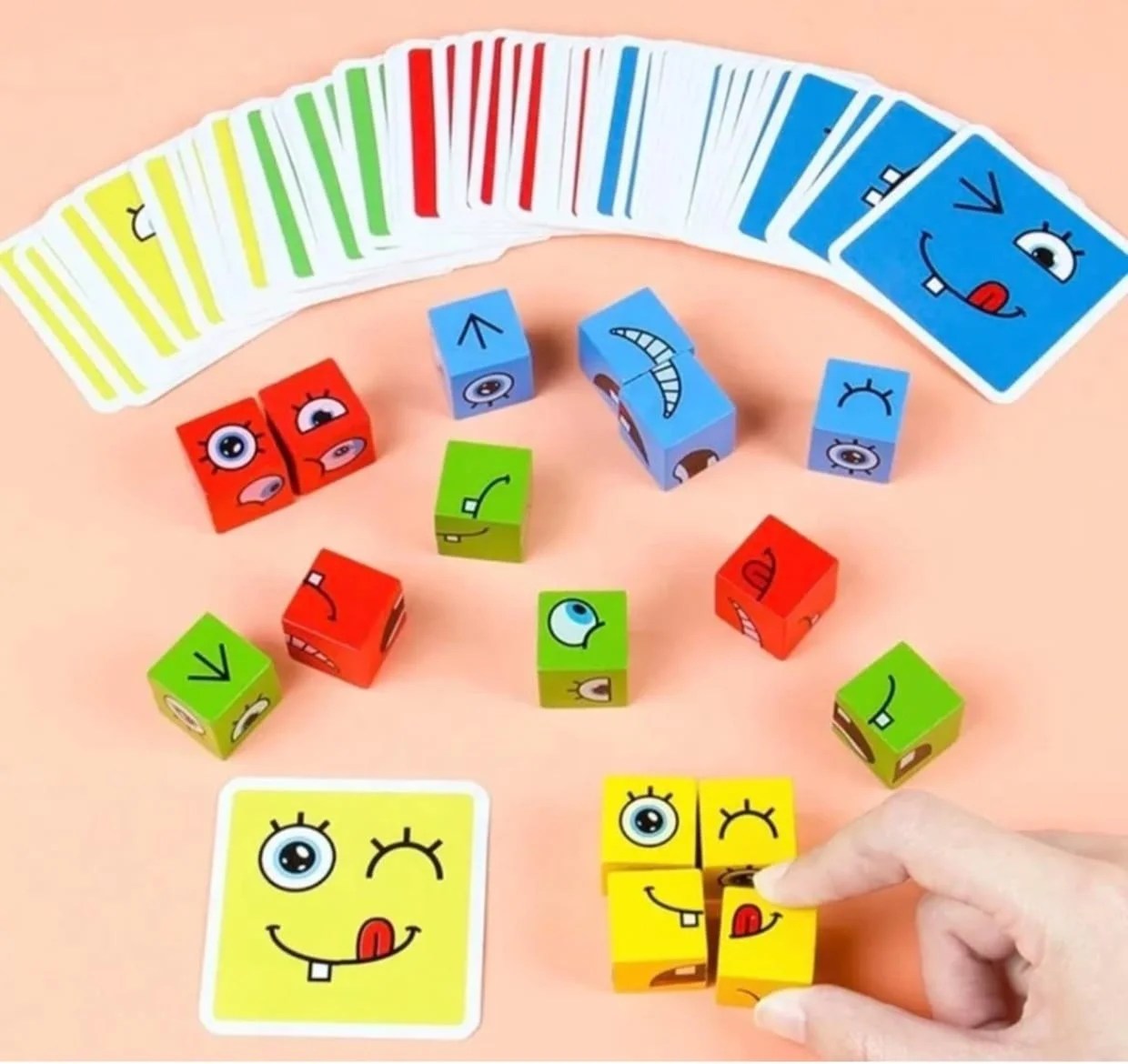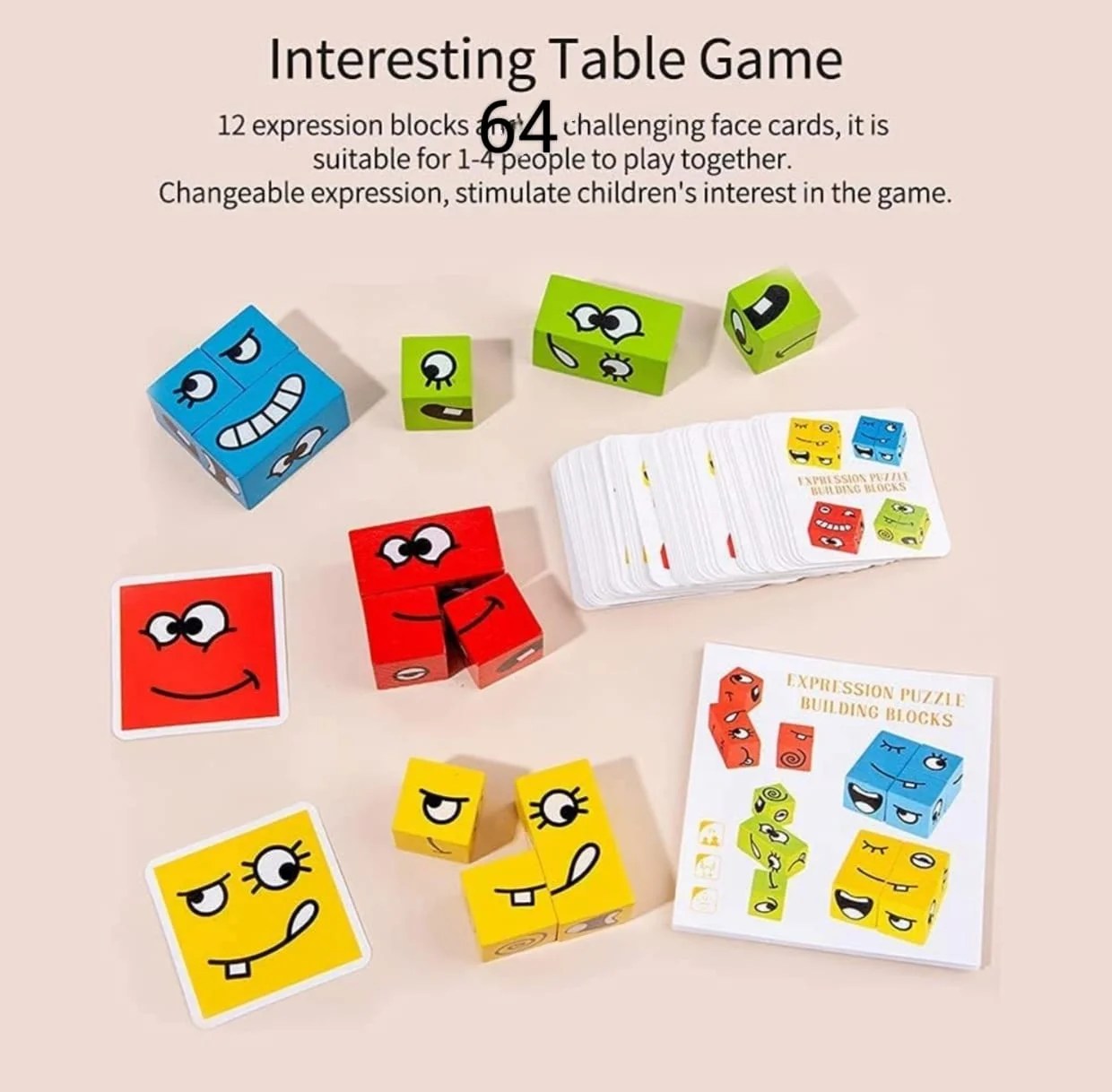 Wooden Expressions Emoji Face Changing Matching Block Puzzle Educational Games Come With 16 square wood print models, 64 challenge cards with changing faces.