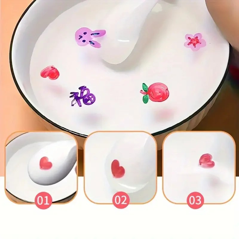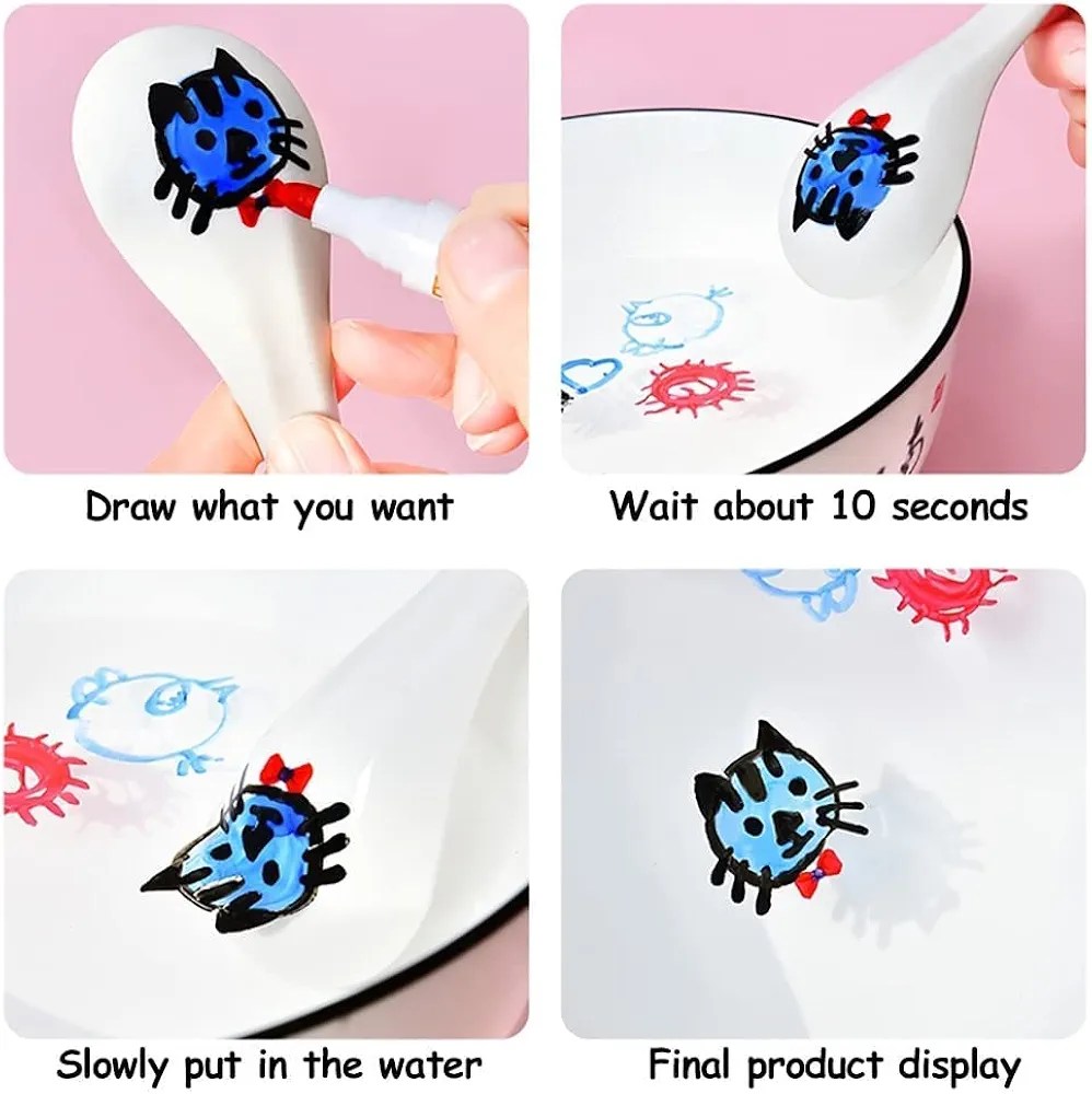 Use this floating pen to paint on the ceramic/steel spoon.wait it for 5 mins to dry.and dip it in water for 5 mins to float. When encountering water, the drawn pattern will float by itself, as if there is life, which is very interesting! Children can experience the joy of crafting! It’s conducive to the children’s sensory development. This is also a fun game for family and friends gatherings. Find Innocence together! .Quick-drying, smooth writing, no ink leakage. The water-based ink is easily wiped off with a cloth without leaving any trace.