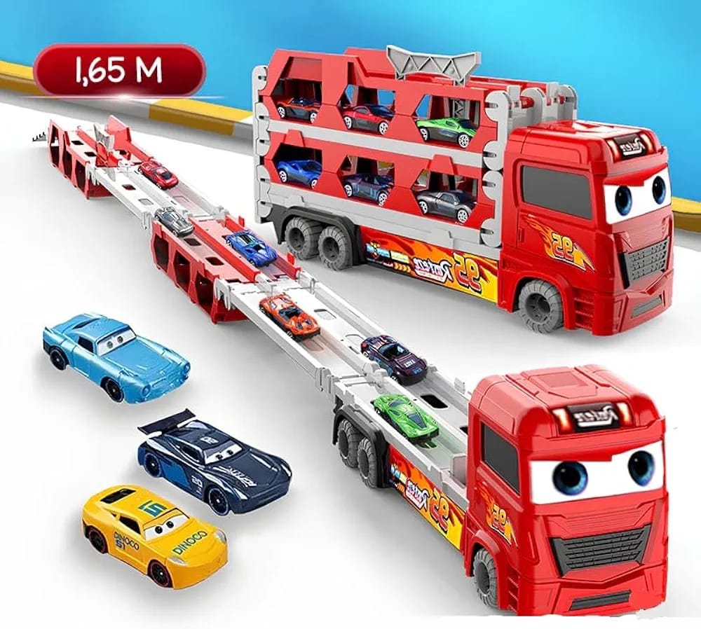 [3-In-1 Transport Truck Toys】 This transport truck playset for kids comes with cool transforming function, kids just need to stretch the folding wagon and instantly transform it into a 61 inch long racing track with dual track design and one-touch ejection function, perfect for kids and their buddies to have a crazy and exciting racing competition game!