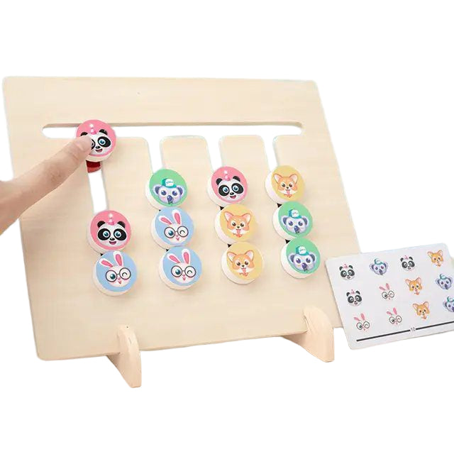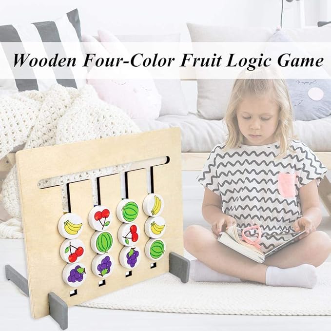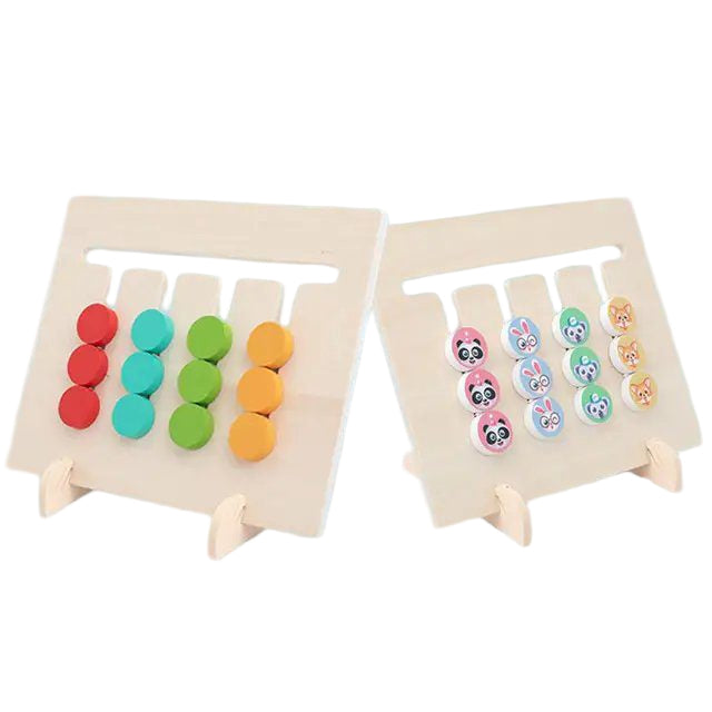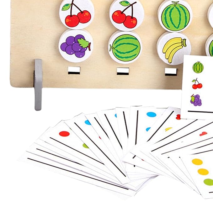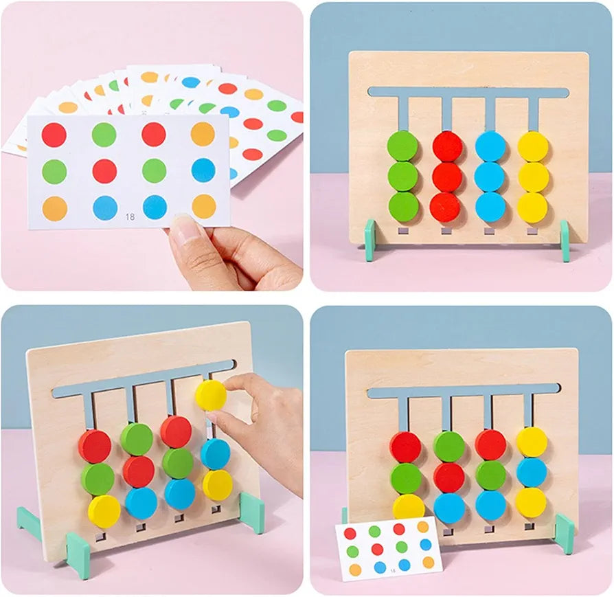 Reverse Side (Color Matching):When the board is flipped over, children use the plain colored circular discs to match the color patterns displayed on the back of the reference cards.