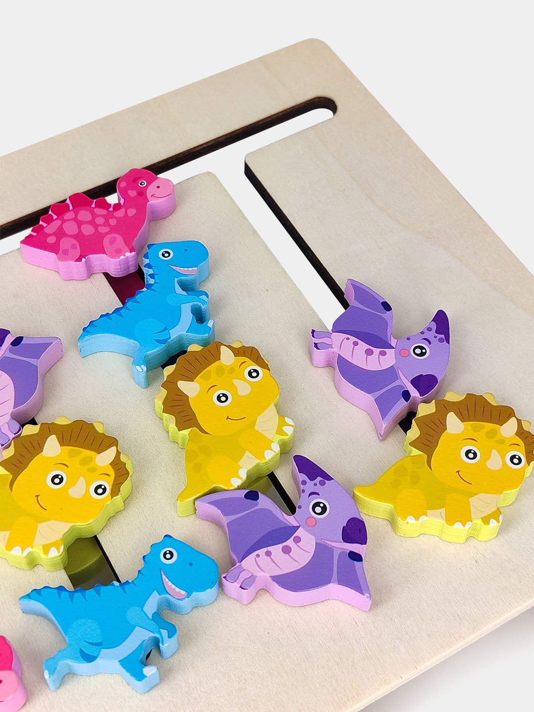 Positive Side (Dinosaur Pairing):Kids use the side with the dinosaur shapes to match the patterns shown on the front of the reference cards by sliding the pieces into the correct positions.