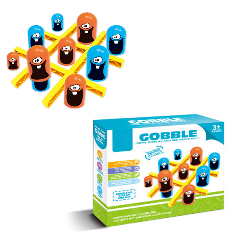 Game Rules: Like tic-tac-toe game, line up 3 in a row to win! BEWARE: Players can gobble up their opponent’s pieces to take their place.