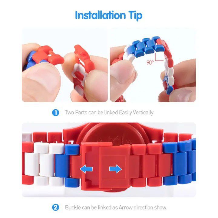 The watch features interchangeable links, allowing for customization and fitting various wrist sizes, and can be assembled like building blocks.
