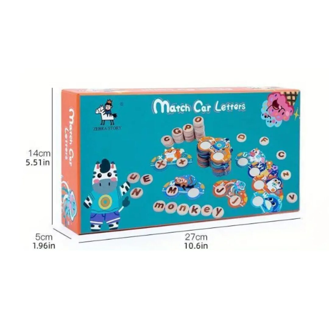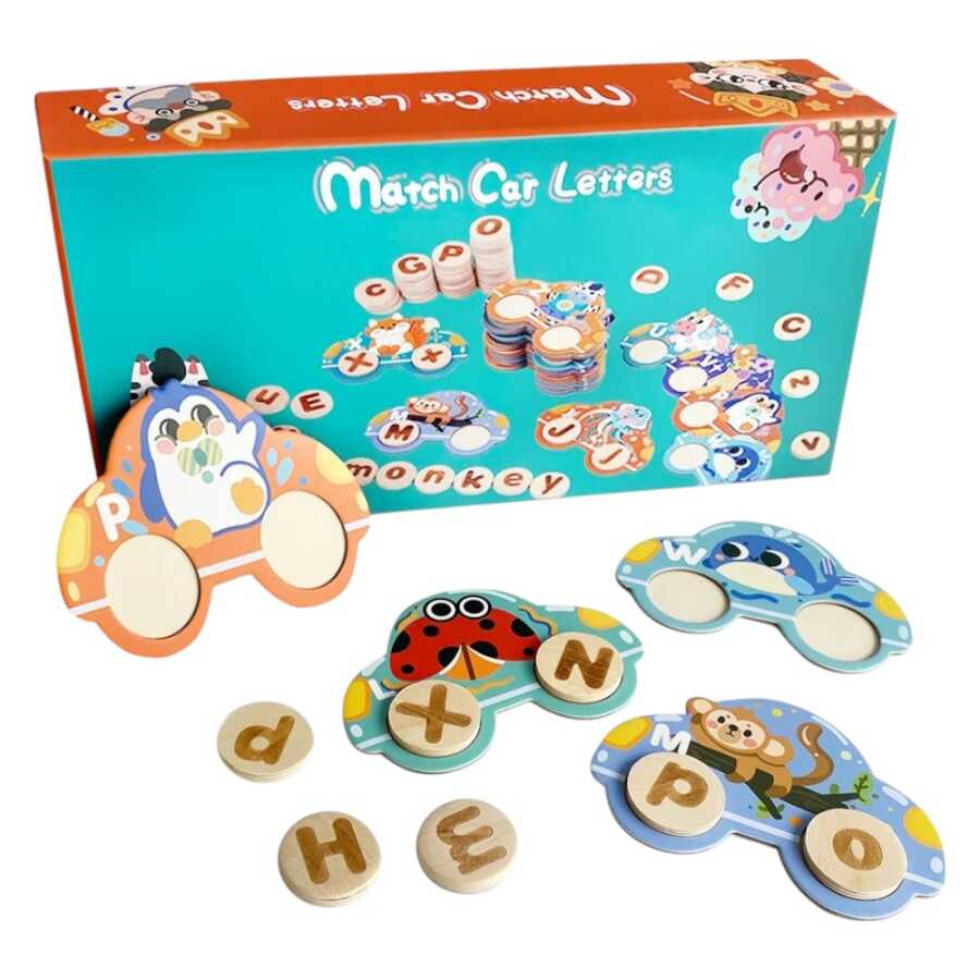 Contents:The set includes colorful car-shaped pieces, each featuring an animal and a lowercase letter, and matching wooden circular tiles with uppercase letters.