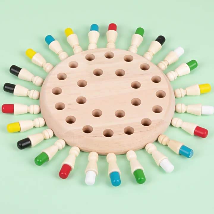 Gameplay: Insert the wooden pegs to the peg board randomly with colours hidden and try to remember the colour of each peg. Roll the dice to reveal a colour, find a matching color pin on the board, and collect as many pieces as possible.