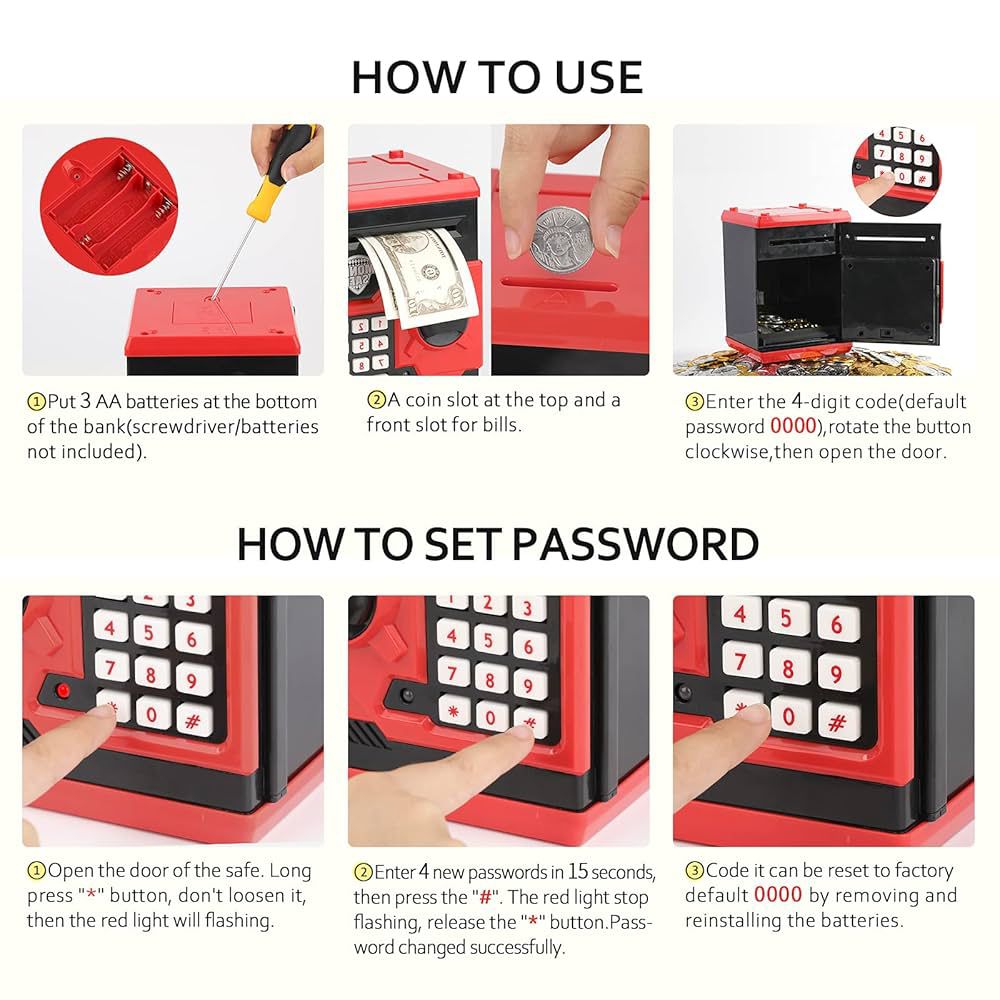 Keep Safe Money: Open the door of the kids safe with 4-digit code(default password 0000). ATM piggy bank for boys, easy to program a personalized code, perfect for what your boys/girls needed to keep their money safe! Kids will love hiddening their “valuables” in this coin bank.