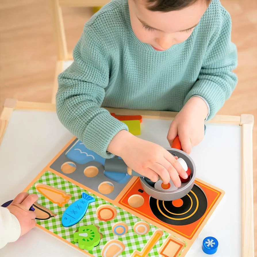 PROMOTES EARLY DEVELOPMENT: Perfect for both boys and girls, it’s the ultimate toy to keep little creative brains challenged and help kids improve their fine motor skills too. The 16 beautiful solid wood accessories are perfectly sized for little hands to grasp and slot into the right place, just like a jigsaw. As your child stirs up some veggies or flips a fried egg, they’ll fine-tune their hand and eye coordination, concentration and dexterity.