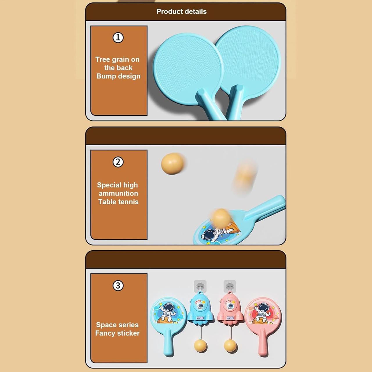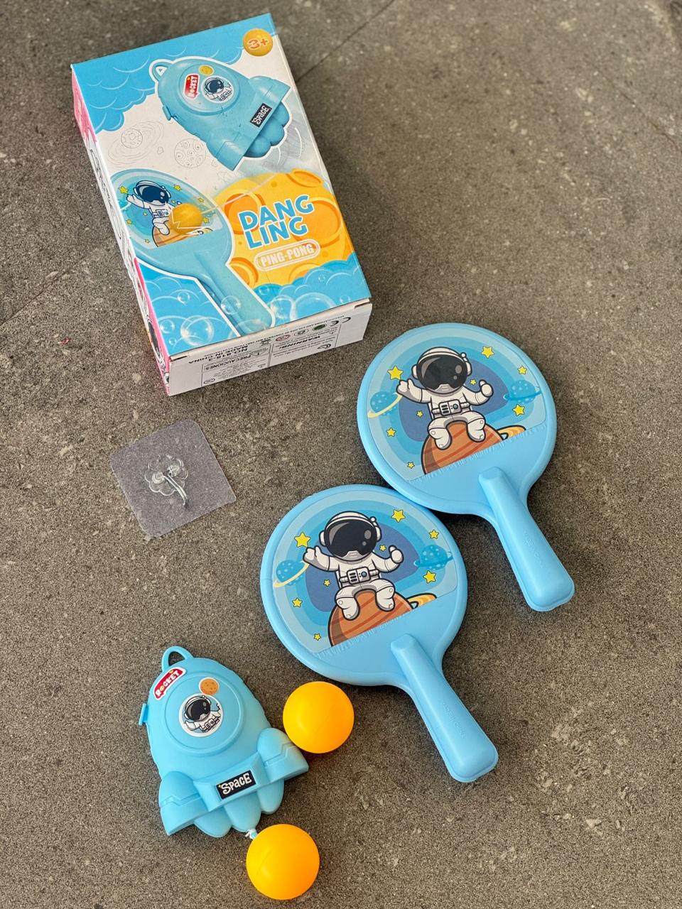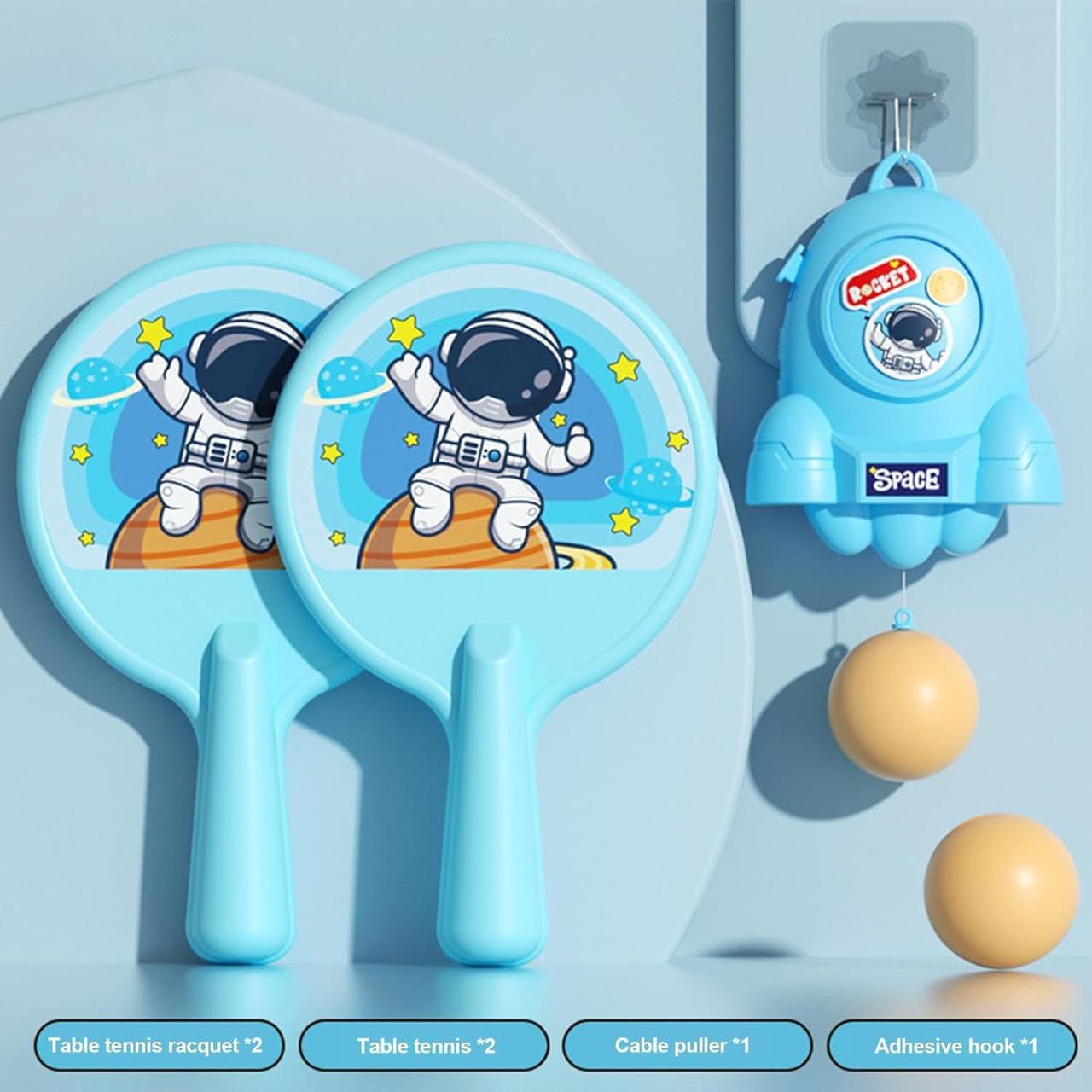 It typically includes rackets, balls, and a hanging mechanism (like a hook or sticker) to attach the trainer, often featuring a rocket design.