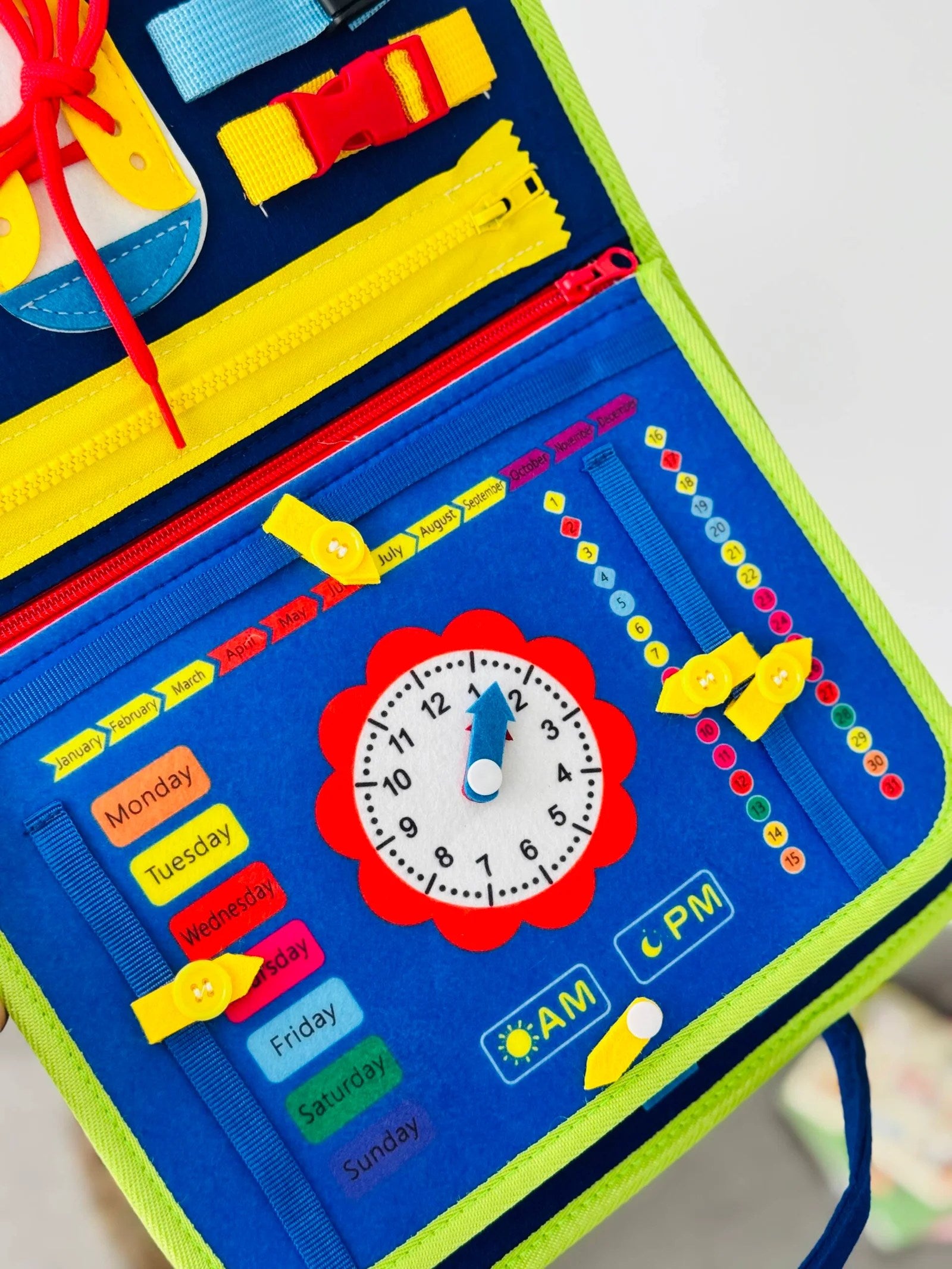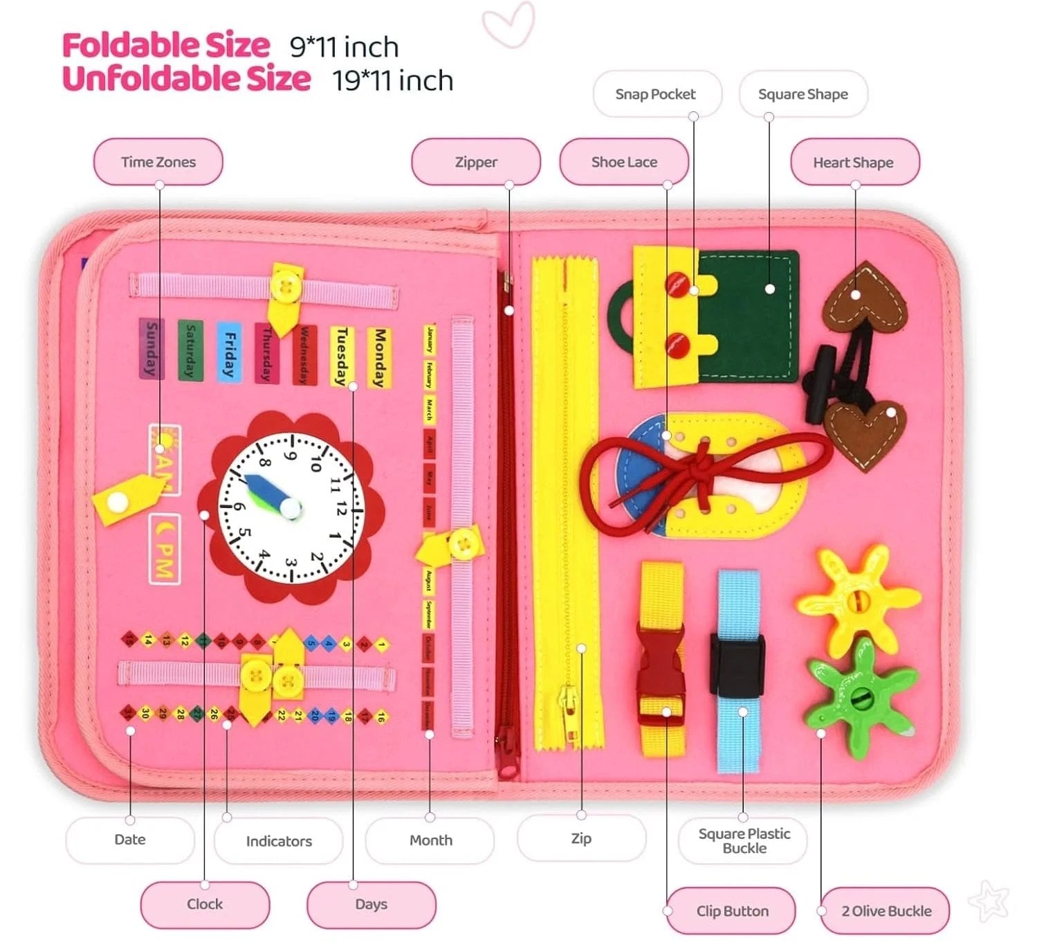 【Busy Board Educational Toys】Montessori educational busy board helps your kids to develop fine motor skills.This montessori toddler toy for contains multiple skill activities, including buckles, zipper, shoelace, belt, button, clock, calendar, shapes matching etc.Good for practical life skills and cognitive development.