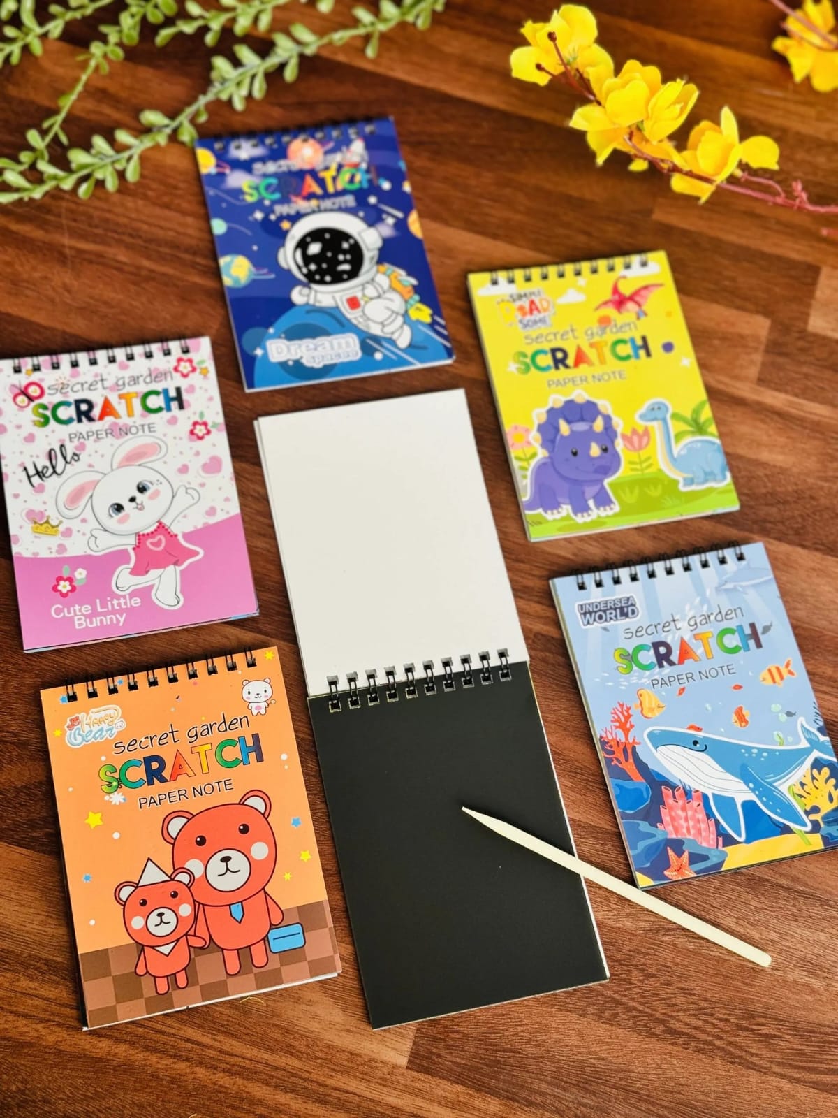 Scratch Art Notebook each provided with a wooden stylus. Each notebook is spiral-bound having 10 pages for scratch art.