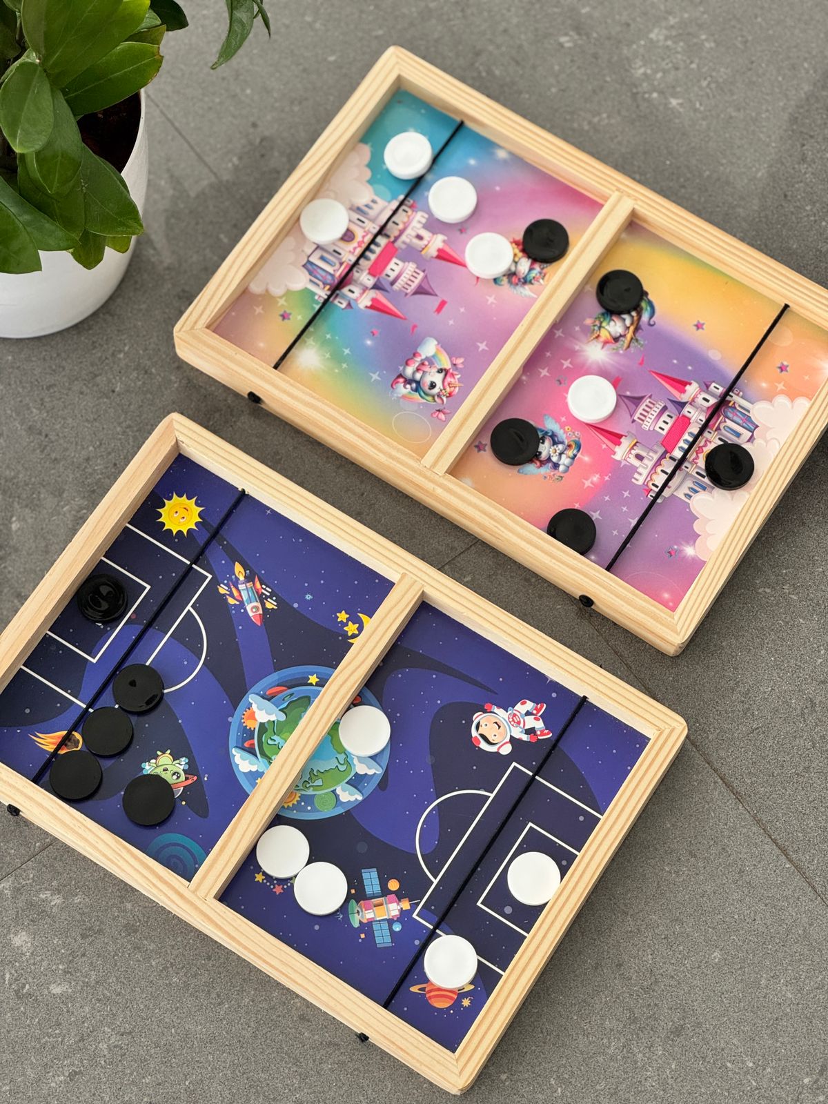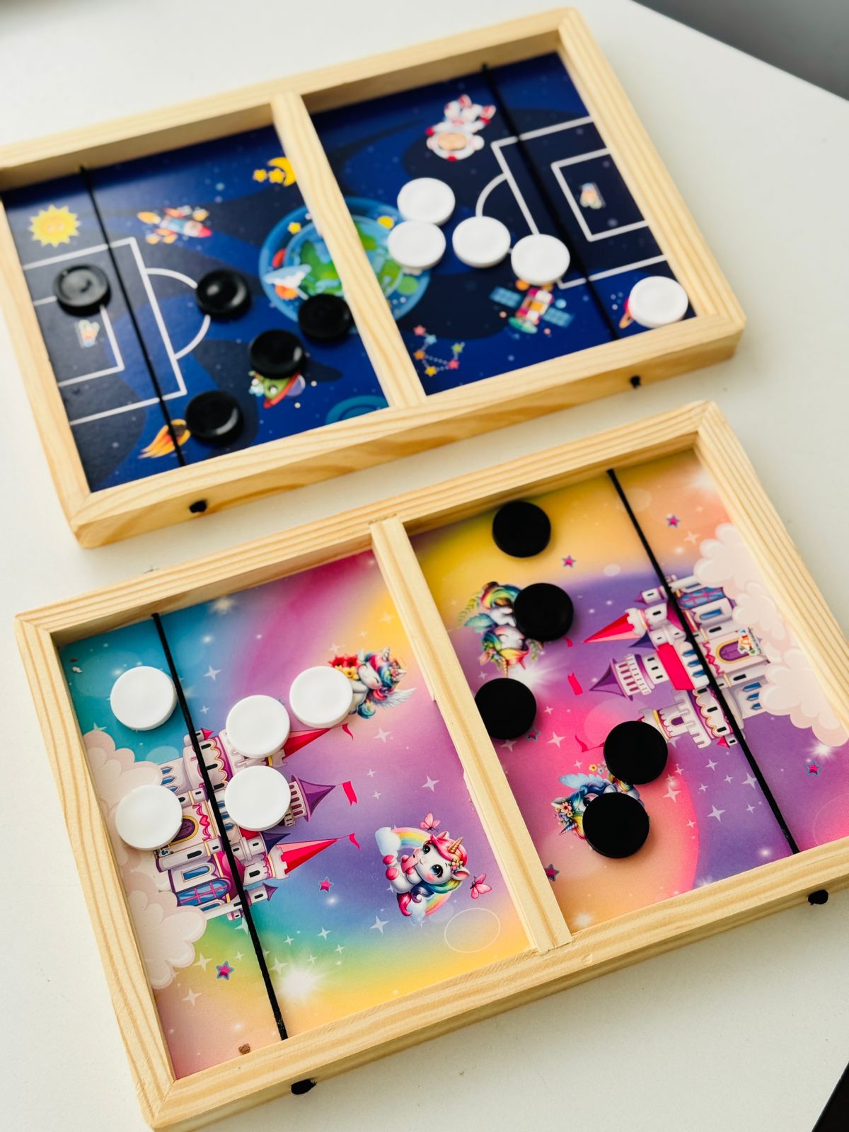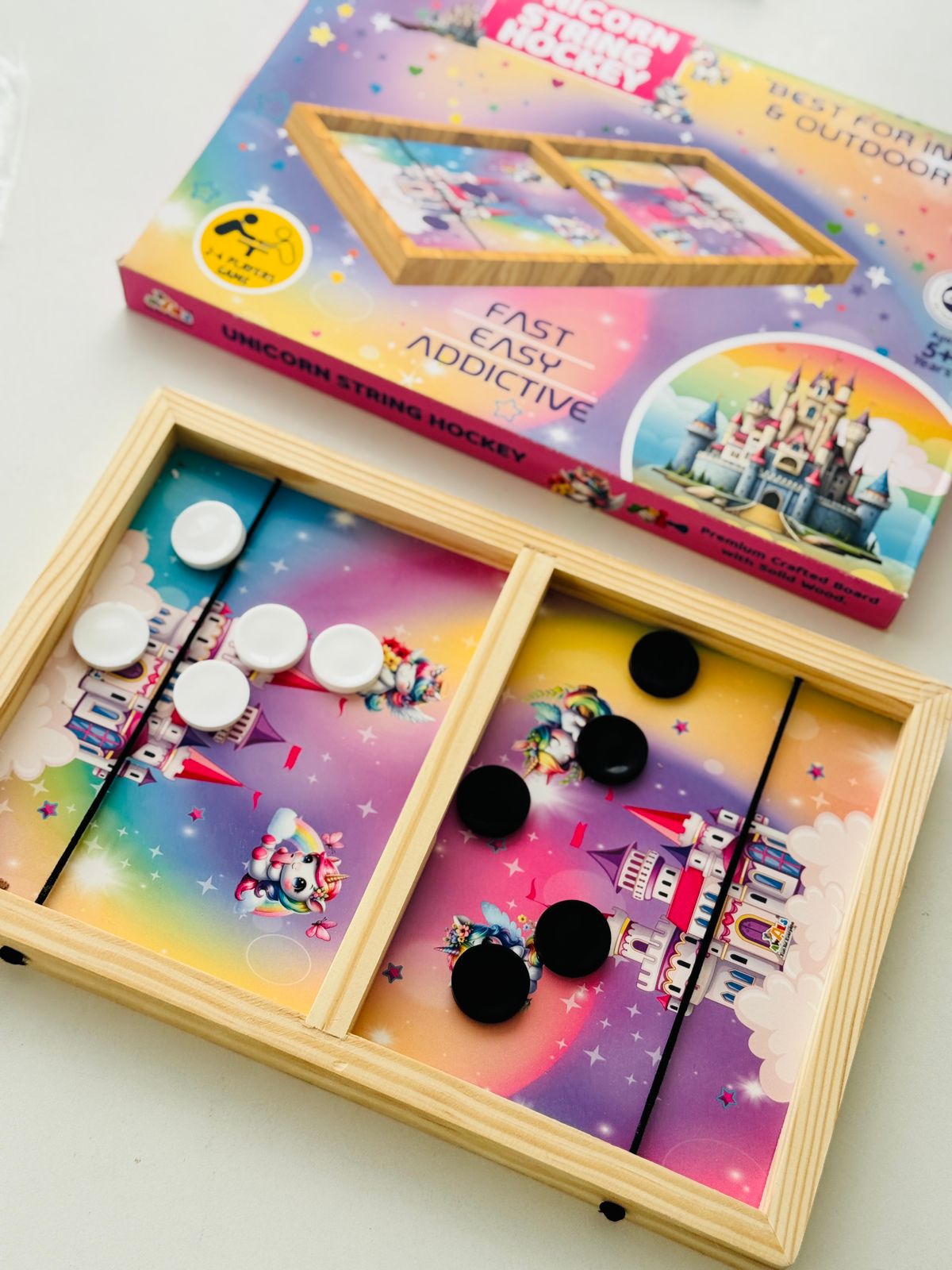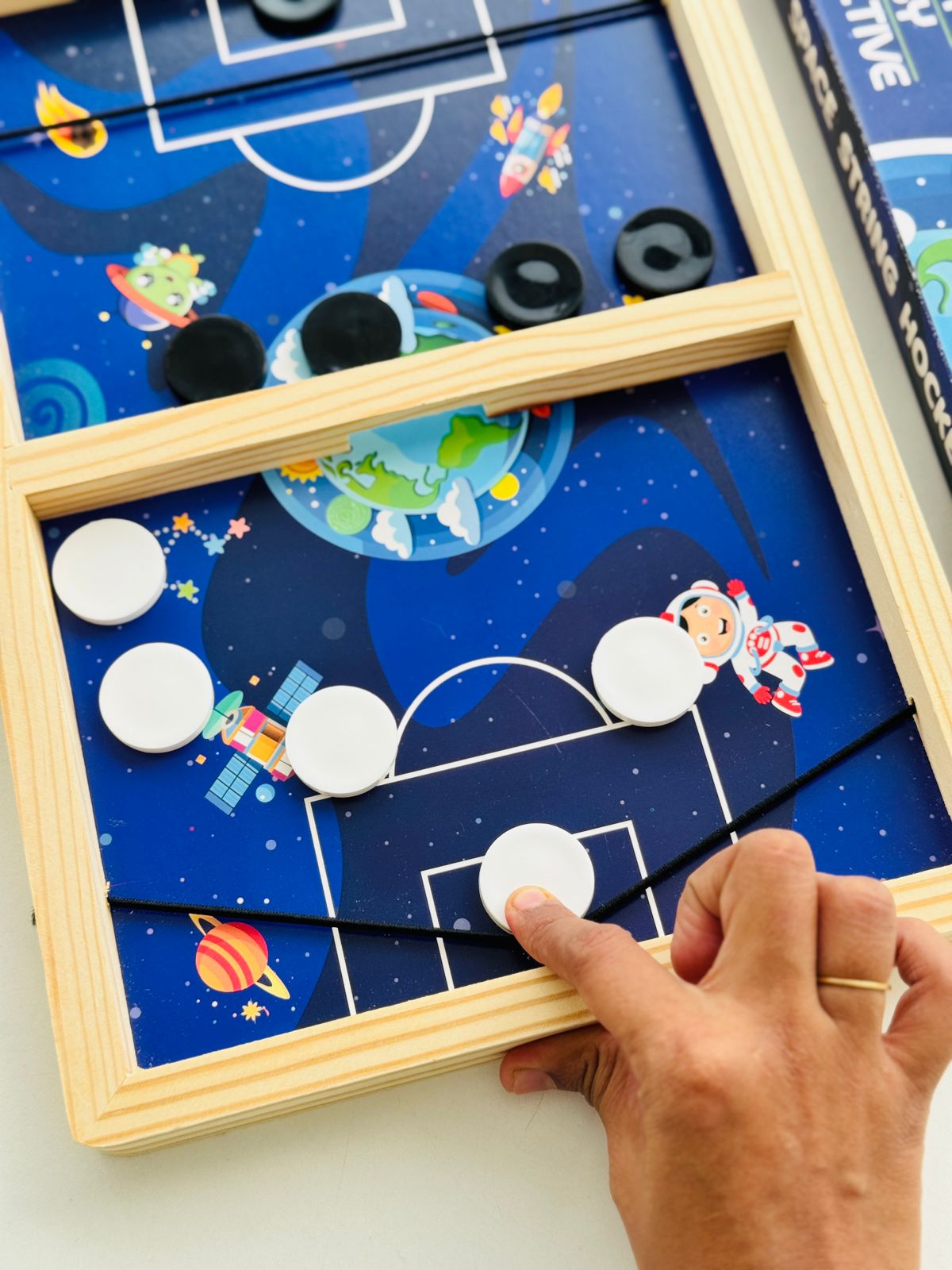 Players simultaneously use the elastic string to launch their pucks through the central opening (goal) to the opponent’s side of the board.