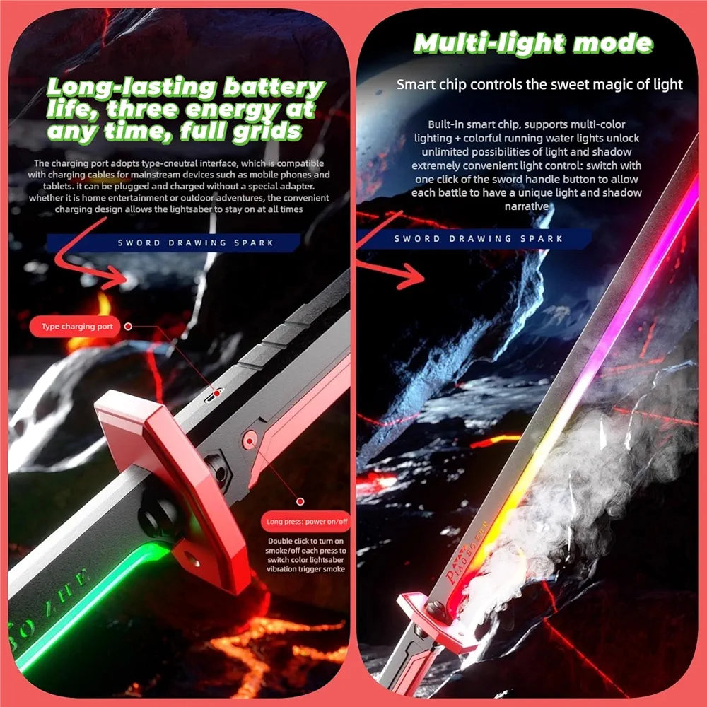 【Easy to Use & Long-Lasting Effects】 Simply press the button to unleash the sparks, flash, and smoke effects. Powered by batteries, this LED sword offers long-lasting glow and entertainment for cosplay and display.