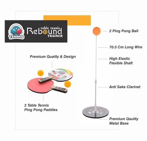 Rebound Trainer: A flexible rod attached to a sturdy base with a table tennis ball on top. The rod rebounds the ball when hit, providing continuous play and practice.
