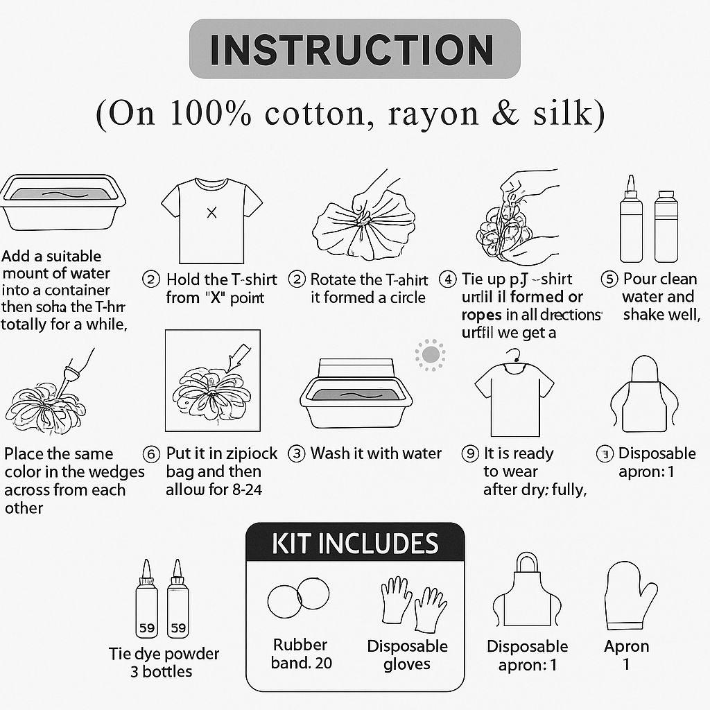Kit includes : 3 color tie and dye powder ,rubber band 20,disposable gloves,apron