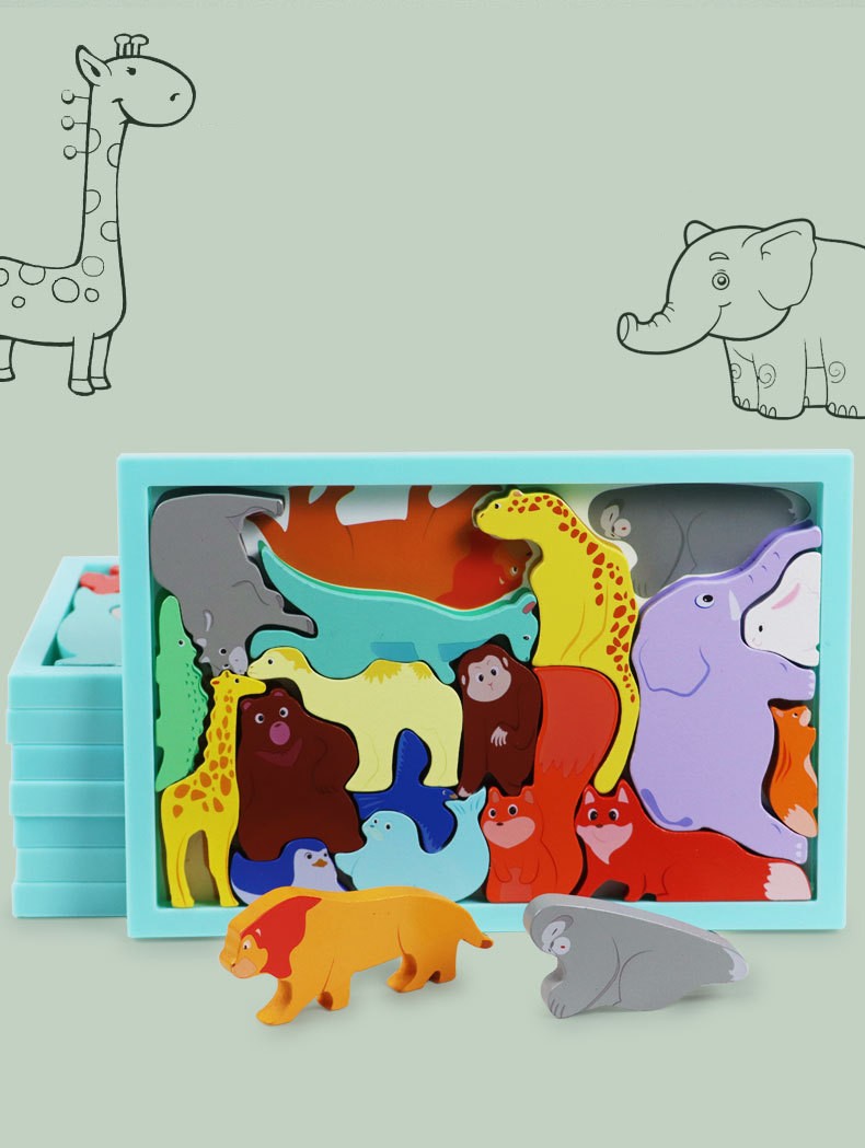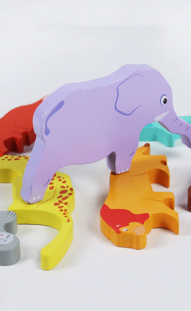 The toys can be used as a traditional jigsaw puzzle to fit pieces into the matching grooves on the board, or as a stacking game to build balancing skills.
